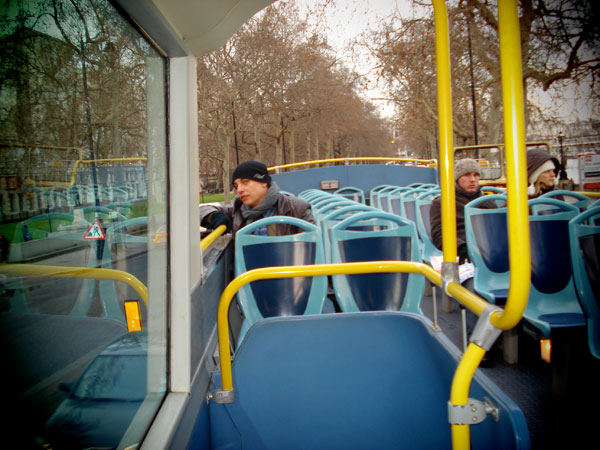 Assim que chegamos em Londres, na estação Saint Pancras, pegamos o ônibus que nos guiou em um tour por toda a cidade. O ponto de partida desse passeio fica na Pancras Rd., ao lado da estação. Existem várias empresas de turismo que fazem esse passeio, que é uma forma rápida e prática de ver os principais pontos turísticos de Londres. O ônibus têm um narrador que conta a história da cidade, que pode ser ouvida por um fone de ouvidos. O veículo possui dois andares, sendo o segundo sem cobertura, facilitando a vista da arquitetura de Londres. Ao comprar o bilhete do ônibus você pode pegá-lo quantas vezes quiser em um dia.