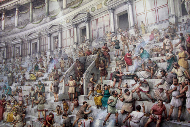O nome Coliseu (Colosseo) se deve à estátua colossal de Nero, que ficava ao lado do anfiteatro. Construído entre os anos 70 e 90, era capaz de abrigar por volta de 50.000 pessoas, sendo usado para vários tipos de espetáculos. A visitação interna é muito bacana. De todas as vezes que fui a Roma, somente nessa é que conheci o interior do monumento. Ali dentro, além de exposições históricas, existem algumas curiosidades. Achei o máximo uma ilustração da plateia em um dia de espetáculo. Nessa imagem, havia pessoas berrando em direção à arena, mulheres se agarrando aos tapas, homens caídos de bêbados, outros fazendo sua “farofa” ali mesmo em seus fogareiros improvisados. Ou seja, divertir-se naquela época não era nada diferente de nos dias de hoje. O mais engraçado é que aquela bagunça toda não combinava com a arquitetura do edifício, originalmente revestido em mármore e repleto de estátuas. A impressão que tenho é que arte e farofa se reuniam para prestigiar uma série de espetáculos.