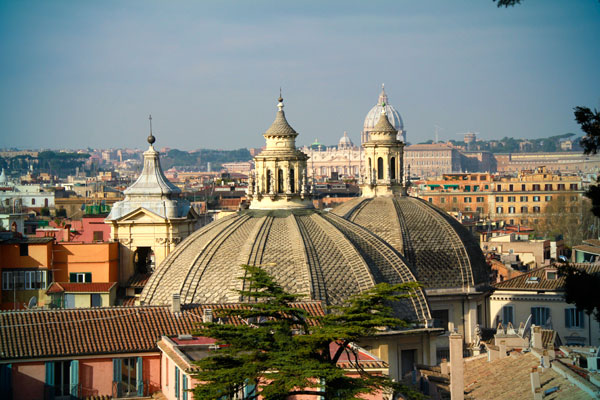 Cúpulas das igrejas gêmeas Santa Maria in Montesanto e Santa Maria dei Miracoli, vistas da Villa Borghese.