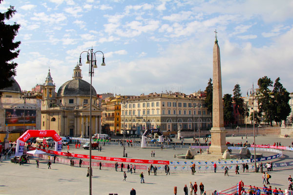 Da Villa Borghese descemos até a Piazza del Popolo. Uma pena que, naquela praça, uma das igrejas gêmeas, como são chamadas a Santa Maria in Montesanto e a Santa Maria dei Miracoli, estava em reforma. A simetria dessas igrejas é a marca registrada da praça. Como uma estava coberta de tapumes, ficou “manco”. Para piorar, naquele dia acontecia uma maratona e a praça estava toda enfeitada com material promocional dos patrocindaores do evento. Eu queria uma foto matadora, mas infelizmente não deu.