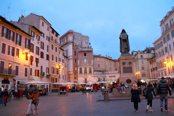 No centro da praça está localizada a estátua do filósofo Giordano Bruno, queimado vivo ali mesmo pela Inquisição romana, em 17 de fevereiro de 1.600.