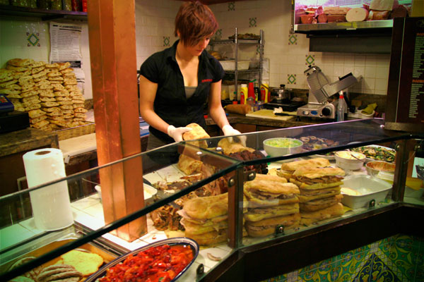 Balconista prepara um panino di porchetta, no Ristocampo.