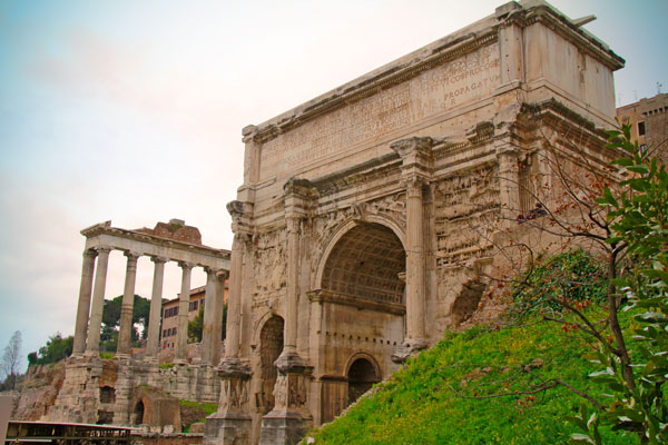 Fórum Romano, com destaque para o Arco de Sétimo Severo.
