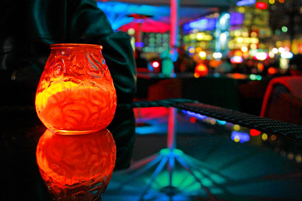 Decoracão de mesa de um bar sob a Fernsehturm.