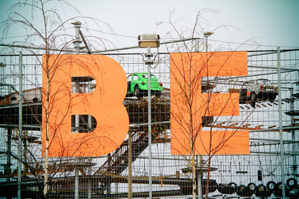 Fusca e Trabant suspensos em estrutura ao lado do Park am Nordbahnhof.