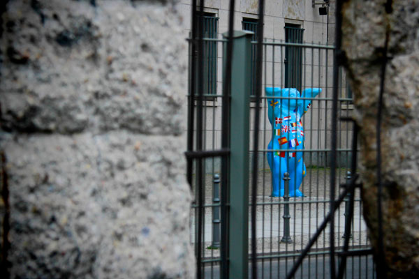 Buddy Bär na Niederkirchnerstrasse, visto pela fresta do Muro de Berlim, na Topografia do Terror.