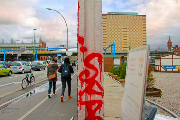 Localizada ao longo da Mühlenstrasse e às margens do Spree, a East Side Gallery é uma galeria a céu aberto instalada numa das partes remanescentes do Muro de Berlim. Seus 100 murais ocupam uma área de 1,3 quilômetro de pura arte de rua, os quais retratam a euforia e o otimismo da época do fim da Guerra Fria.