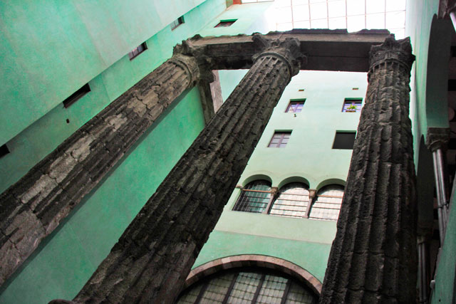 Da Plaça de Sant Miquel fomos a uma atração pouquíssimo procurada em Barcelona: o Temple Romà d’August (Templo Romano de Augusto). Foi bem complicado encontrar o local. Ninguém sabia o que era, nem mesmo um cidadão cuja casa fica a dez metros da entrada do templo. Enfim, por mais simples que pareça, o pequeno monumento é formado por ruínas daquilo que foi o principal templo romano de Barcelona, dedicado ao imperador César Augusto.