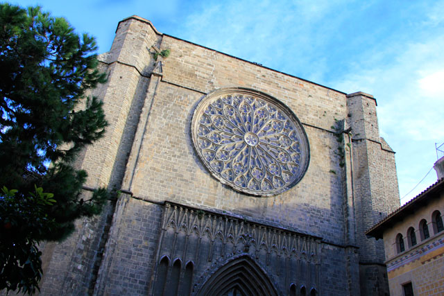Do templo seguimos para outra catedral: a Santa Maria del Pi, construída no século XIV e situada na praça de mesmo nome. Muito bonita tanto por fora quanto por dentro. Entretanto, já não era mais novidade. Assim como aconselho que se evitem vários museus em um só dia, o mesmo digo para as igrejas. O excesso de atrações parecidas em um curto período pode banalizar as mais importantes. Não sei quanto aos meus amigos, mas achei a Santa Maria del Pi mais ou menos. Um pecado eu dizer isso, mas depois de tanta maravilha em um dia intenso, aquela catedral foi apenas outro monumento bonito, visto que na Ciutat Vella (Cidade Velha), principalmente no Bairro Gótico, tudo é muito antigo e belo e qualquer monumento é pop star.