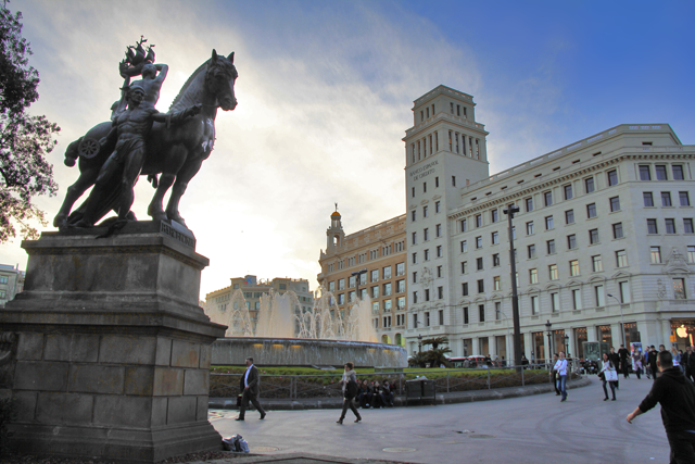 Deixamos o La Boqueria e continuamos nossa caminhada pela Rambla de Barcelona até a já mencionada Plaça de Catalunya, principal praça da cidade, situada no ponto que separa a cidade antiga do Eixample (ensanche).
