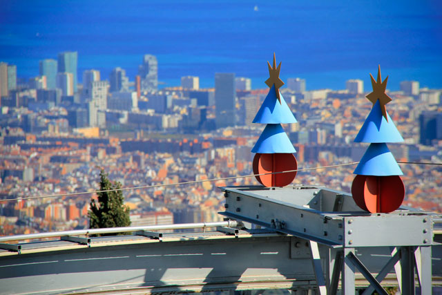 Tudo contribuía para que Tibidabo fosse um dos nossos lugares favoritos. Primeiro, pela surpresa: não esperávamos que fosse tão interessante assim. Segundo, pelo astral do lugar: ali está o Parc d’Atraccions, que, com mais de 100 anos de idade, é um dos parques de diversões mais antigos do mundo e o mais antigo de Barcelona. Portanto, a atmosfera era muito boa. Terceiro, pela vista deslumbrante: em Barcelona, o que mais se têm são vistas deslumbrantes, mas a dali é única! Lembra que expliquei o neologismo tibidabear, criado pelo Élcio? Surgiu a partir do panorama exuberante que se tem de Tibidabo. Naquela altitude, os brinquedos do parque, além da adrenalina que proporcionam, são uma espécie de mirantes radicais que convidam à contemplação de um mundão de cidade e mar. Quarto, pela beleza do templo do Sagrat Cor (Sagrado Coração), uma igreja católica localizada no topo da montanha, visível de quase toda a cidade.