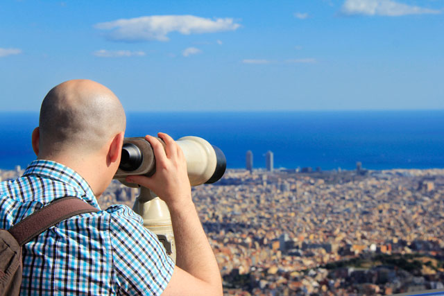 A cada estágio da subida tem-se uma vista de cair o queixo. Quando se chega ao topo, o panorama é sensacional! Para nossa alegria, não havia filas para o museu, então aproveitamos o tempo de sobra e espiamos Barcelona por alguns minutos. O local é tão inspirador e o céu estava tão azul, que um grupo do tipo zen se instalou numa parte daquele mirante para uma de suas sessões de meditação contemplativa. Confesso que queria ter participado um pouco do ritual. Queria inclusive ter feito a posição de “cadeirinha”, conforme expuseram em um determinado momento.
