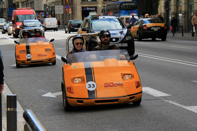 Depois da Clarice escolher cuidadosamente um azeite para seu amado Lenir, deixamos o mercado e fomos em direção à praia. Seguimos pela Via Laietana, passando diante da Plaça Ramon Berenguer el Gran, onde se localiza parte da Muralha Romana. Nessa via, também vimos uns carrinhos muito práticos e interessantes. São da empresa Go Car, que fazem um tour em Barcelona guiado por meio de GPS. Possuem audio guide integrado e levam o turista aonde ele quiser. Cabem duas pessoas por carro.