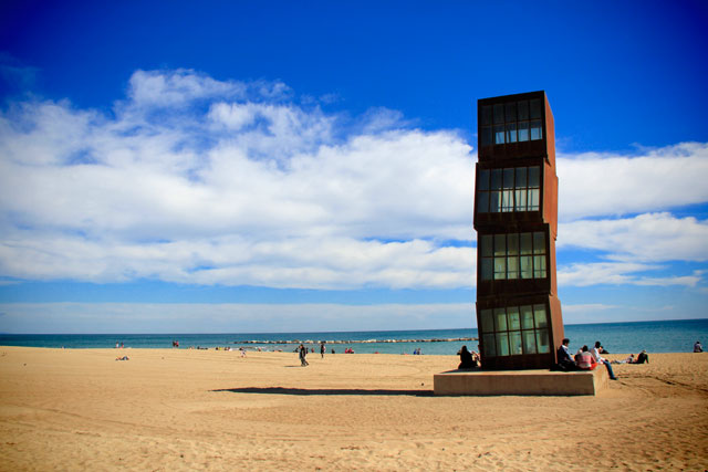 Na Praia de São Sebastião existe uma escultura que lembra um prédio todo desalinhado. Chama-se Homenatge a la Barceloneta (Homenagem a La Barceloneta), da artista alemã Rebecca Horn. Adorei a obra! Eu e uns quatro elementos sentados à sua base, que fumavam um tipo de cigarrinho de artista.