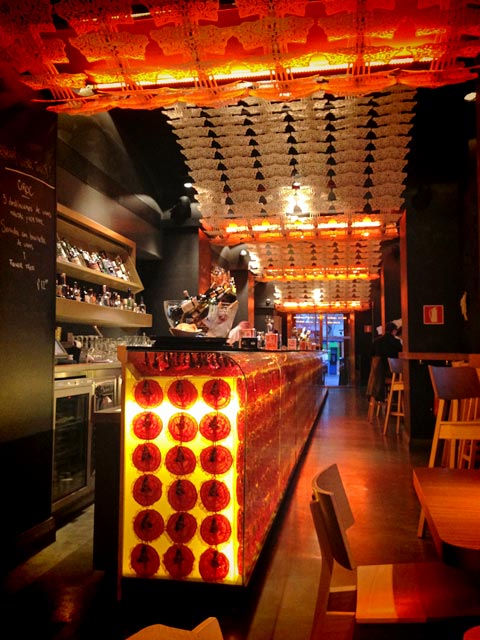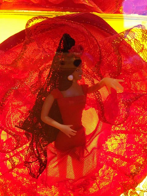 No caminho, descobrimos um bar muito bacana, localizado na Plaza del Ángel, esquina com Calle San Sebastián. Chamava-se En Estado Puro, e sua decoração era composta, basicamente, de centenas de bonecas de dança flamenca que compunham uma padronagem sensacional. O quadro negro na entrada anunciava rodada dupla drinques até as 20h. Se a noite é uma criança e a promoção é boa, não tem por que não aderir. Eram 19 e alguma coisa e resolvemos entrar para umas biritas pagas seguidas de outras 0800.