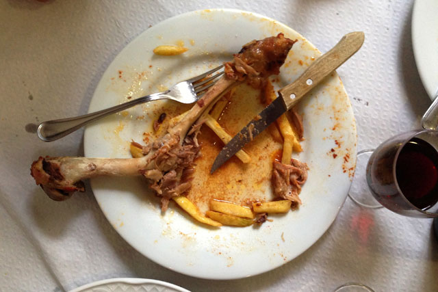 Almoçamos antes de partir. Somente naquele último dia descobrimos que havia um restaurante com preços excelentes, pertinho de onde estávamos hospedados. O lugar chama-se Cafetería Rincón de Atocha, situado na Calle de Atocha, 20, próximo à Plaza Jacinto Benavente. Suas avaliações na internet não são muito boas, mas a comida estava excelente e o serviço também, portanto dou um joinha para o lugar. Se você perguntar ao Élcio o que achou do restaurante, ele dará cinco joinhas e fará questão de mostrar a foto do seu prato já vazio, onde existia um suculento cordeiro.