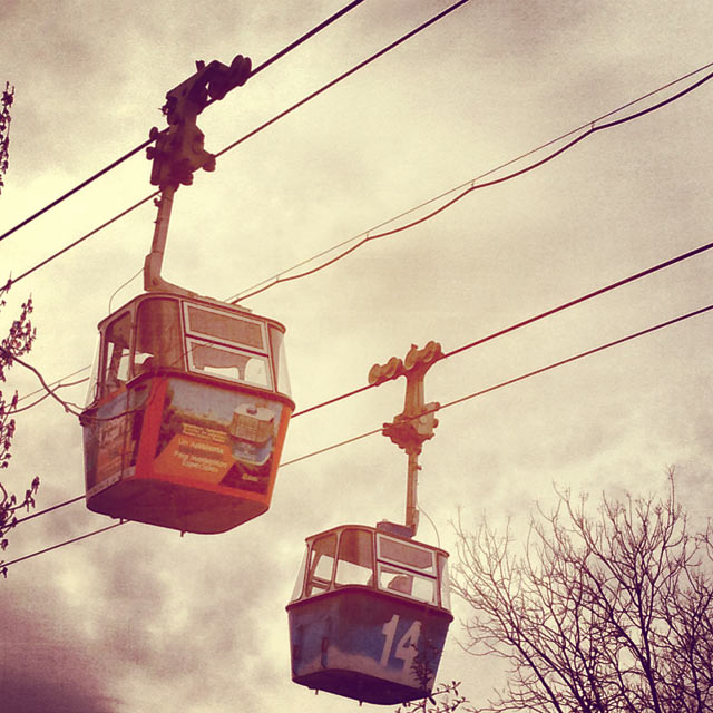Dali, rumamos para a parte da viagem mais horripilante para a Clarice: o passeio no Teleférico de Madrid. Em Barcelona, a colega quase morrera do coração no Teleférico de Montjuïc, portanto era certo que ela não embarcaria em mais uma roubada. Fizemos o seguinte: enquanto eu e o Élcio passeamos no bondinho, ela saltitou e cantarolou pelos jardins do Rosaleda de Madrid, logo ao lado da estação do teleférico. Boa menina.