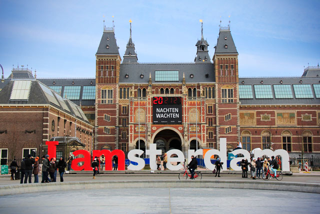 Letreiro “I amsterdam” com Rijksmuseum ao fundo