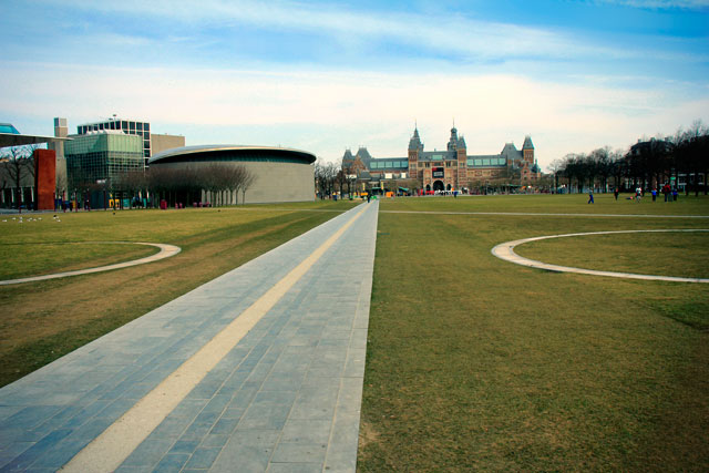 Deixamos o Vondelpark e seguimos caminhando até a Museumplein, praça que abriga os principais museus da cidade: o Rijksmuseum, o Van Gogh Museum e o Stedelijk Museum. Ali também está o Concertgebouw, teatro que possui uma das três melhores salas de concerto do mundo, juntamente ao Symphony Hall de Boston e ao Musikverein de Viena.