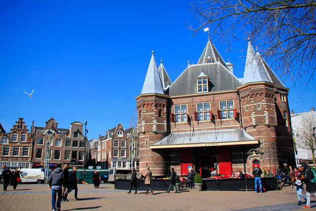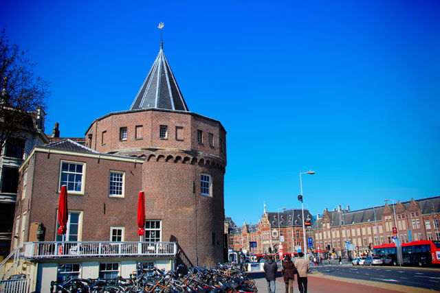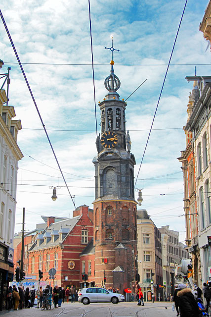 Mesmo estando no Hermitage Amsterdam, não visitamos sua exposição permanente. De lá, fomos almoçar. Comemos rapidinho, pois estávamos muito afim de seguir adiante. Na caminhada, passamos pela Munttoren, torre que foi originalmente parte do Regulierspoort, uma das principais portas do muro medieval da cidade. Construída em 1480, consistia em duas torres e uma casa de guarda. Após um incêndio, em 1618, apenas a casa de guarda e parte de uma das torres permaneceram de pé.
