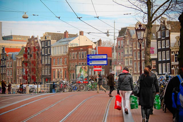 Satisfeitíssimos com a comida, seguimos nossa caminhada pelas redondezas. Passeamos pela movimentada rua Leidsestraat, visitando lojas de roupas, souvenirs e doces e cruzando alguns dos tantos canais que visitaríamos nos dias seguintes. Não é por menos que Amsterdam é também conhecida como a Veneza do Norte. Porém, se possui 165 canais, num comprimento combinado de 100 quilômetros, e a própria Veneza possui 150, os quais compreendem apenas 42 quilômetros, é a cidade italiana que deveria se chamar Amsterdam do Sul. Brincadeirinha! Veneza é incomparável.