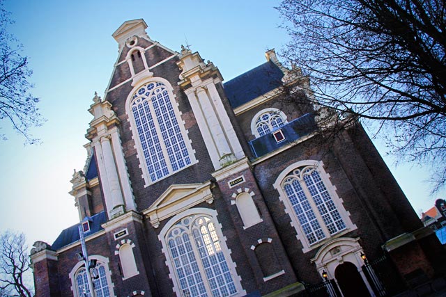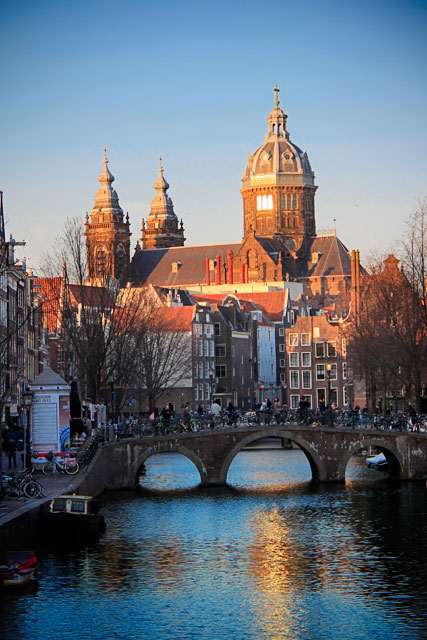 Canal Singel, na região das Nove Ruas. Igreja católica De Krijtberg ao fundo