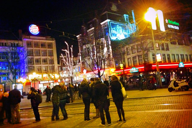 Conosco não tem essa bobagem de chegar, tomar um banho e começar um passeio. Simplesmente despejamos as malas no quarto e zunamos para a rua. Não demorou e já estávamos no ponto mais movimentado da cidade: Leidseplein.