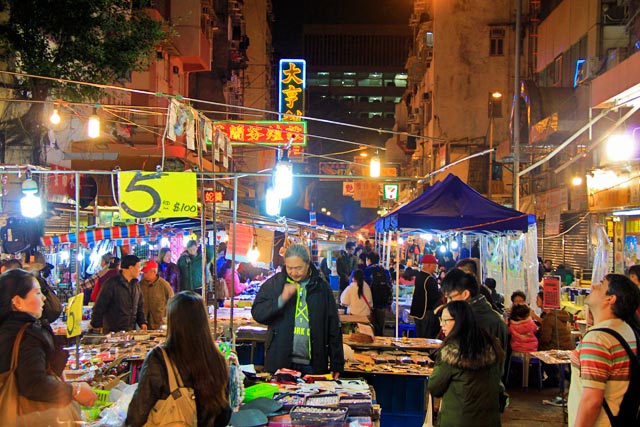 Ponto turístico é ponto turístico, então não posso apedrejar a Temple Street com críticas motivadas por impressões pessoais. Se a rua é famosa por seu mercado noturno, merece, pois, ser visitada, seja para comprar artigos de segunda ou terceira linha – há quem goste –, seja para admirar o movimento local, que é bacanérrimo! É importante frisar que a Temple Street é dividida em duas partes: uma que começa na Man Ming Lane e termina na praça Yung Shue Tau, na Public Square Street, e outra, a dois quarteirões, que se inicia na Kansu Street e se estende até a Jordan Road. Naquela noite, visitamos somente a primeira parte. Dias mais tarde, fomos à segunda, e a qualidade dos produtos era a mesma da primeira: uma porcariada só! Porém, amigo turista, não se preocupe. Nos dias seguintes, encontramos vários mercados interessantes para gastar nossos dólares de Hong Kong.