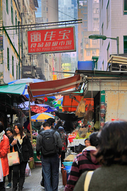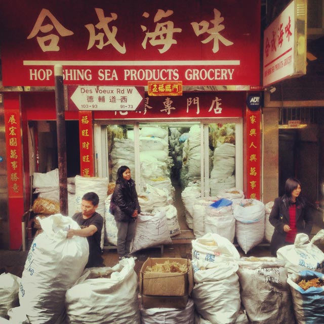 Começamos nossa caminhada por um pequeno trecho da Des Voeux Road, rua do Ibis. Viramos à direita na Connaught Road e seguimos até o observatório do edifício do IFC (International Finance Center). Como o bairro é lotado de estabelecimentos especializados em frutos do mar desidratados, o cheiro durante o trajeto não era dos melhores para mim, que detesto peixes, répteis e anfíbios.