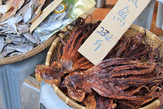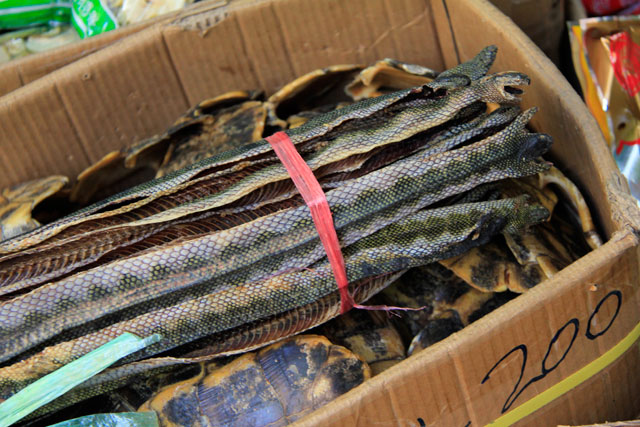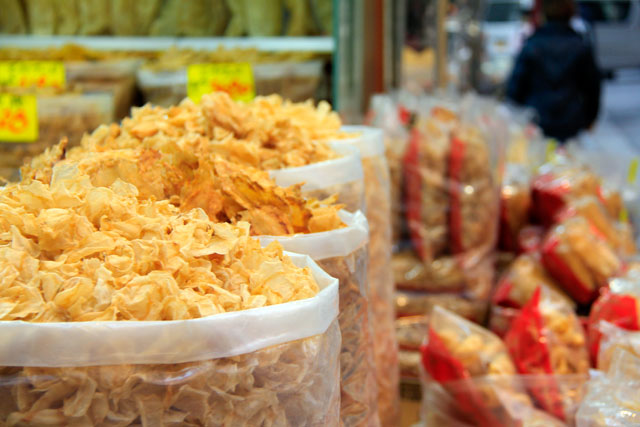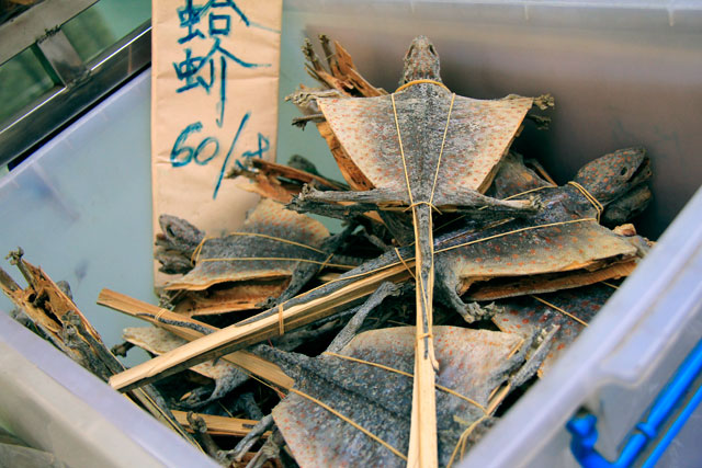 Vimos lagartos e cobras esticados, polvos ressecados, pepinos do mar, patas de animais não identificados (cachorro?), chips de camarão e tantas outras criaturas prontas para o preparo. Eu ficava só pensando no pobre coitado do funcionário encarregado de abrir uma loja daquelas pela manhã. Imagina o odor concentrado que sai!