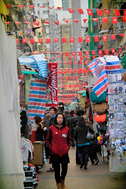 Abaixo do IFC, está a Central, principal estação de metrô de Hong Kong. Orientados pela moça do guichê de informações, embarcamos na linha Tsuen Wan (linha vermelha) no sentido Tsuen Wan e descemos na estação Mong Kok, de onde seguimos a pé até a Temple Street, rua que abriga um mercado de pulgas noturno. No entanto, deveríamos ter desembarcado nas estações Jordan ou Yau Ma Tei, antes de Mong Kok. Na pesquisa feita ainda no Brasil, eu havia encontrado a informação certa de como chegar ao mercado, que estava anotadinha no roteiro. Porém, o cansaço da viagem me fez pedir informação. Enfim, andamos bastante até chegar à bendita rua. E não posso dizer que não foi interessante entranhar pelas redondezas. Aliás, adorei o movimento local e o caos das placas luminosas espalhadas por todas as ruas.