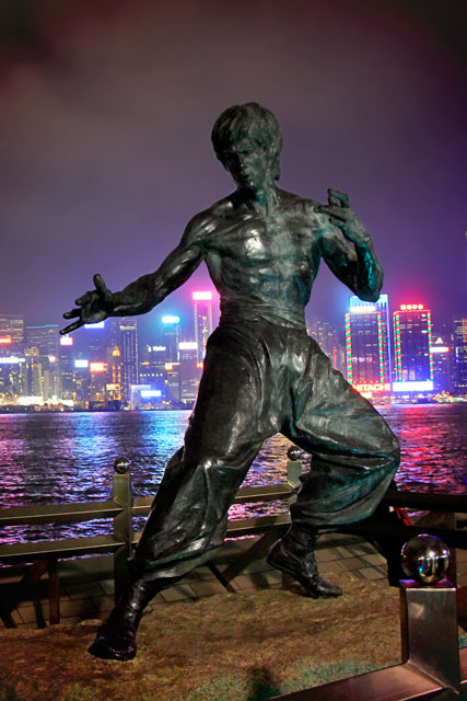 O show durou uns 15 minutos. Depois dele, caminhamos pela Avenue of Stars. Sua extensão expõe 100 anos de história do cinema de Hong Kong, contada por meio de inscrições gravadas em nove pilares. Pelo chão, as celebridades são homenageadas em placas que possuem suas assinaturas e as palmas das mãos gravadas no cimento. A honra maior é atribuída ao ator e mestre das artes marciais Bruce Lee, para quem foi erguida uma estátua de bronze de 2 metros e meio. Impossível não se irritar com os turistas que levam 900 minutos para elaborar suas poses e fotografá-las junto à estátua, como se ninguém mais quisesse uma foto ali. E cada pose…