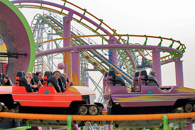 Ainda do teleférico, avistamos a Hair Raiser, uma montanha russa de levantar até os meus cabelos. Como crianças, assim que desembarcamos em The Summit, eu, o Élcio, o Tião e a Yáskara corremos para aquela atração. Foi sen-sa-cio-nal! Deixamos o brinquedo com um grito de “de novo” reprimido, pois ainda havia muito o que visitar no parque.
