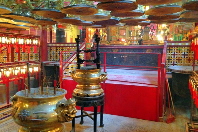 No Man Mo Temple, descobri o real motivo da poluição com névoa seca em HK: os incensos. Meu Buda, quanta fumaça ardida! Aproveitando aquela velha piadinha, chinês não tem o olho puxado por causa da fritura de pasteis, e sim por causa dos incensos. Vivíamos apertando as pálpebras, de tanto que nossos olhos se irritavam.