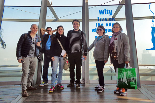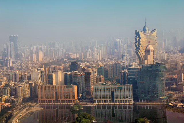 A nossa primeira parada foi na Macau Tower, uma torre de telecomunicações de 338 m de altura. Seu observatório oferece uma vista quase espetacular, não fosse a poluição. Assim como em Hong Kong, o desconforto provocado pela névoa seca em Macau era inevitável, e o panorama da cidade ficava bem prejudicado.