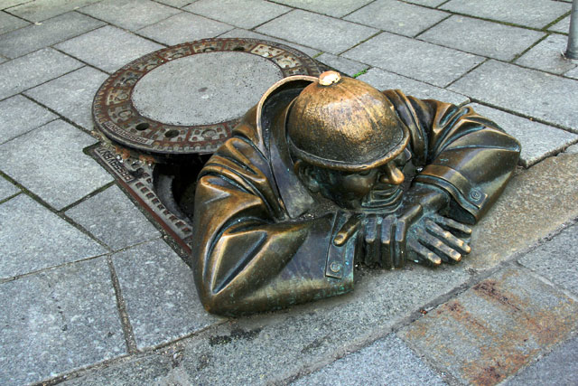 Essa estátua data de 1997 e está localizada na esquina das ruas Laurinská e Rybárska brána, a um quarteirão da Hlavné námestie (Praça Principal). Eu achava que a figura fosse de um soldado, mas representa um trabalhador que espia de dentro de um bueiro. O que ninguém sabe é se ele acabou de limpar o esgoto ou se está ali olhando debaixo das saias das moçoilas. Pela cara de pilantra, pode-se ter uma ideia. Crianças impiedosas abusam de sua posição e sentam-se em sua cabeça, a qual já foi arrancada mais de uma vez por motoristas imprudentes.