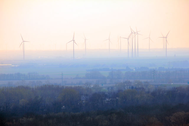 Parque eólico austríaco, situado às margens da autoestrada Nordost, visto do Castelo de Bratislava