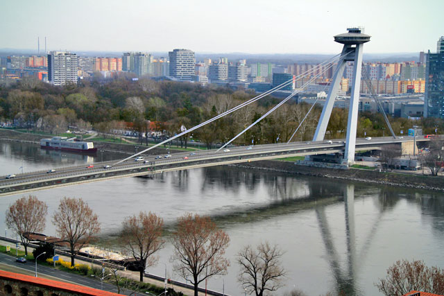 Most SNP (Ponte Ovni) e edifícios do tipo panelák no bairro Petržalka, vistos do Castelo de Bratislava