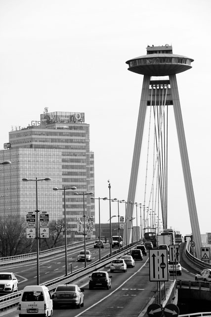 Deixamos o Zulkafe. Descemos a Beblavého até a via Staromestská, onde avistamos a Most SNP (Ponte Ovni), também conhecida como UFO Bridge. Essa ponte se destaca pela estrutura no formato de disco voador suspensa no topo dos pilares, que abarca um restaurante panorâmico chamado UFO.