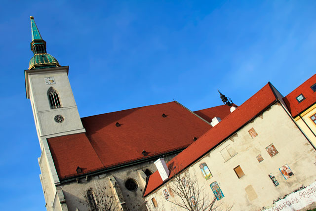 No outro lado da Staromestská, está a Katedrála svätého Martina (Catedral de San Martín), onde demos uma olhada rápida. É um dos templos religiosos mais antigos de Bratislava, conhecido, principalmente, por ser a igreja onde as coroações do Reino da Hungria aconteciam entre 1563 e 1830. É a catedral da Arquidiocese Católica de Bratislava. Desde 2003, vem sediando os Korunovačné slávnosti (Festivais de Coroação), em que as cerimônias de coroação dos antigos monarcas são reencenadas.