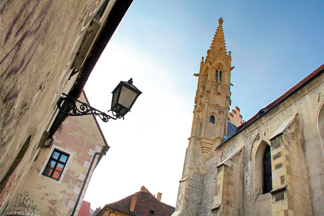 No outro lado da praça, está a Františkánsky kostol (Igreja Franciscana), onde demos uma rápida espiada. Construída no estilo gótico entre 1280 e 1297, foi redesenhada no estilo renascentista no século 17 e tornou-se barroca no século 18. Seu passado foi palco de eventos muito importantes. Ali, Fernando I, Sacro Imperador Romano-Germânico, elegeu-se rei da Hungria, em 1526.