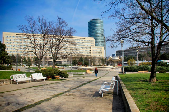 De frente para o palácio, está a Námestie slobody (Praça da Liberdade), onde circulamos rapidamente. Na outra extremidade da praça, encontra-se a Slovenská technická univerzita (Universidade Técnica da Eslováquia).