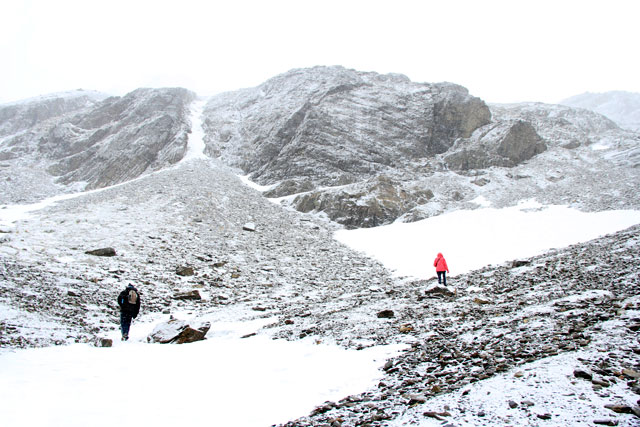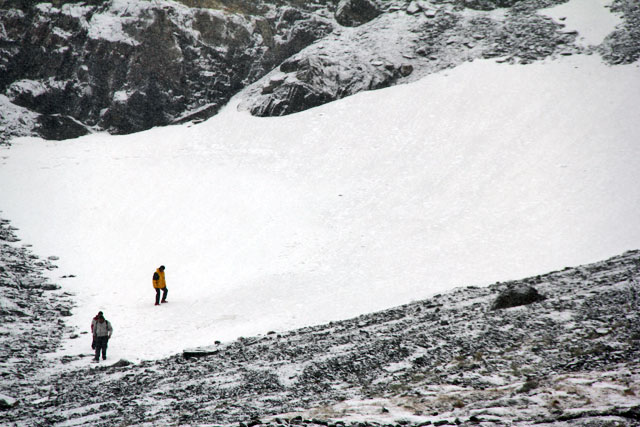 Já havíamos caminhado uma hora e quinze minutos pela geleira. Após percorrer 2.200 metros, decidimos retornar. O vento e a neve estavam cada vez mais fortes e somente os mais destemidos seguiram adiante.