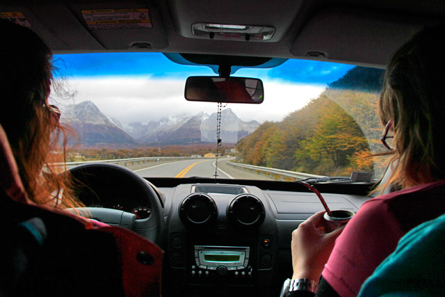 As chicas buena onda nos apanharam no hotel às 10h. Foram munidas de erva-mate, café solúvel, e garrafas térmicas abastecidas com muita água quente, além de todo o aparato necessário para se preparar e degustar o tradicional chimarrão. Pegamos a Ruta Nacional n.º 3 (Rota 3) e seguimos em direção aos lagos.