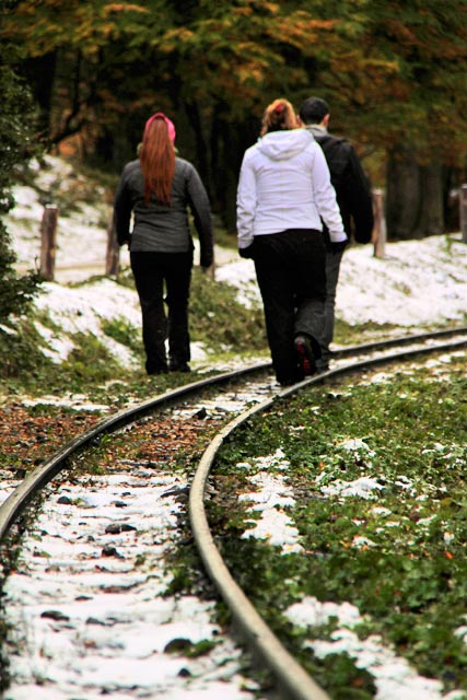 Após a visita à estação, retomamos a estrada nevada e chegamos ao parque. Deixamos o carro estacionado ao lado da Estação do Parque Nacional, ponto final do Trem del Fin del Mundo. De lá, seguimos caminhando rente aos trilhos.