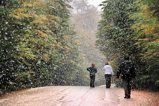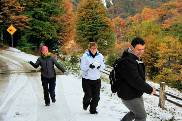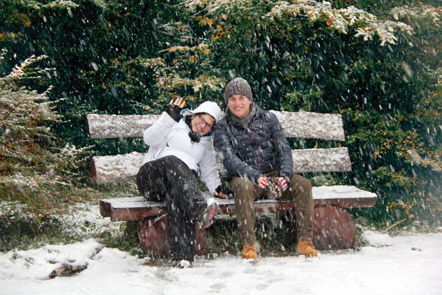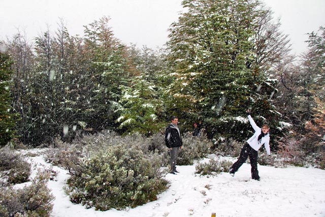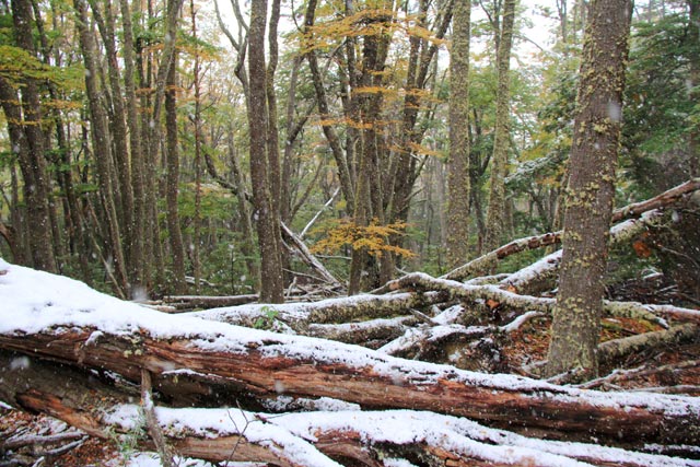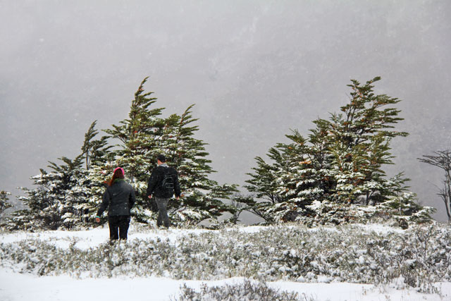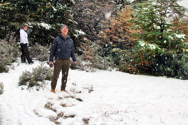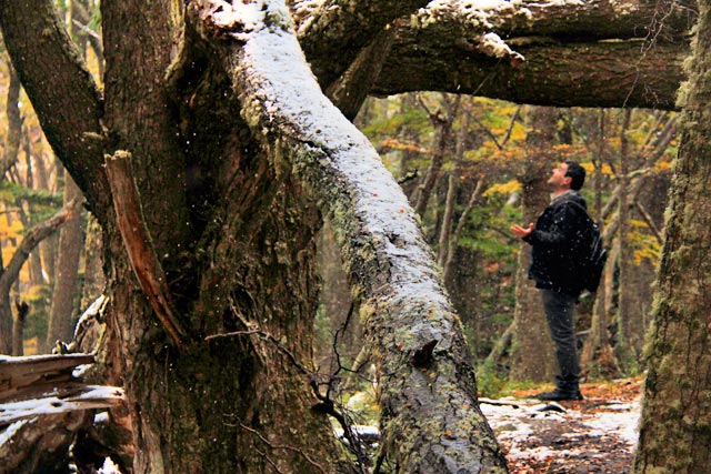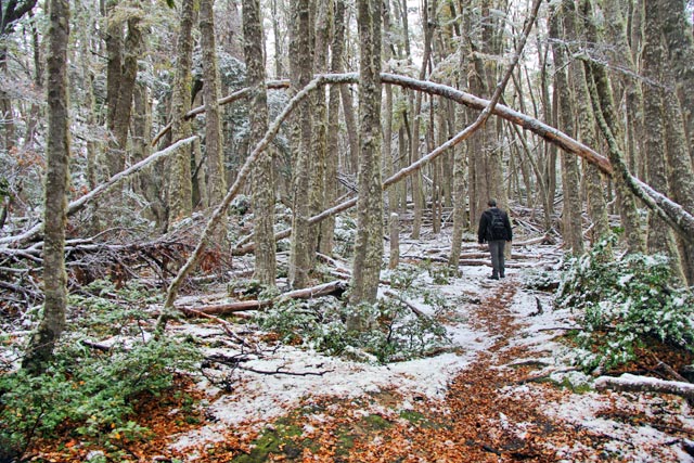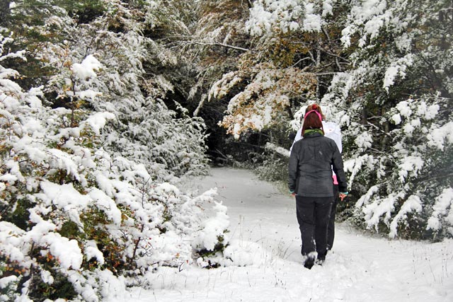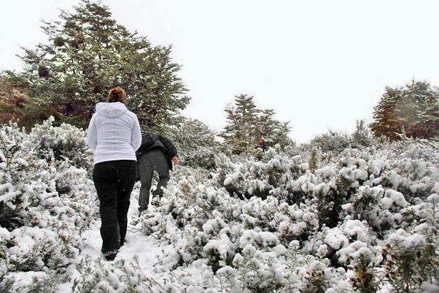 À medida em que embrenhávamos pela belíssima Senda Pampa Alta, a neve, que há pouco estava bem fraquinha, aumentava de volume. Nas clareiras, o chão parecia ter sido polvilhado por açúcar de confeiteiro. Era tudo muito bonito e muito sereno.