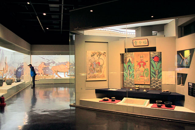 O complexo do Gyeongbokgung também abriga o National Palace Museum of Korea (Museu do Palácio Nacional da Coreia), especializado na Dinastia Joseon e nos artefatos da corte imperial, e o National Folk Museum (Museu do Folclore Nacional), que expõe objetos da cultura coreana desde o período pré-histórico até os tempos modernos. Visitamos somente o segundo, que possui uma exposição bem bacana e a entrada é gratuita. Para mais informações sobre esse museu, acesse www.nfm.go.kr.