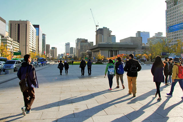 Retornamos à Samcheong-ro na altura do Palácio Gyeongbokgung, onde caminhamos pelo lado externo da muralha em direção à Sejongno, uma via de 600 metros que atravessa o distrito de Jongno-gu, coração de Seul.