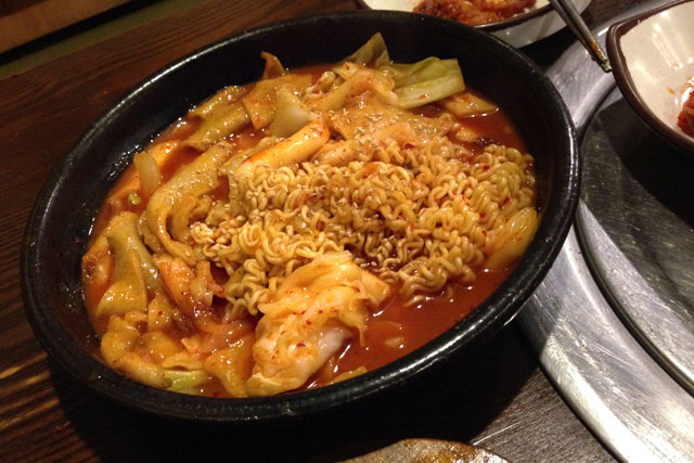 Todavia, não saímos do Kwangjang com o bucho vazio. Servimo-nos do delicioso bindaetteok, uma espécie de panqueca feita à base de ovos, carne de porco, repolho e feijão-mungo. Acho que o meu tinha broto de feijão também. É um prato bastante popular, podendo ser servido com outros ingredientes. Seu preparo é feito em uma chapa quente encharcada de óleo, o que deve ter me descontado uns três meses de vida, de tanta gordura que ingeri.