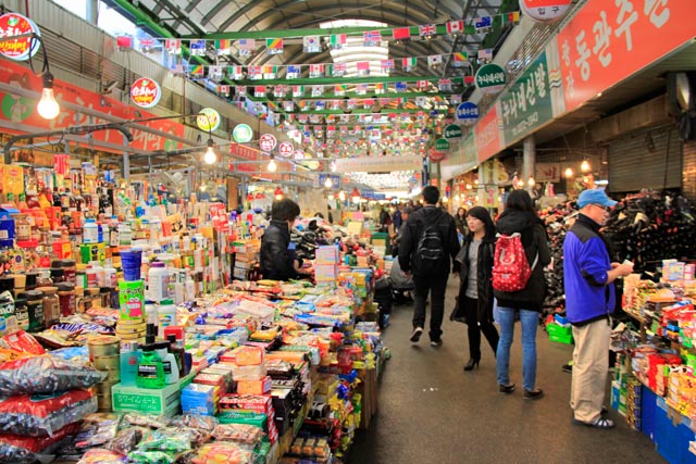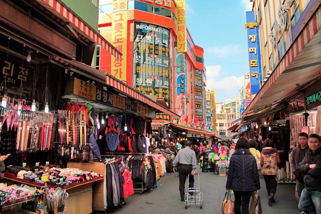 Depois de uma rápida visita pelo lado de fora do portão, caminhamos pela Yulgok-ro até a via Jangchungdan-ro, onde está localizado o Dongdaemun Design Plaza (DDP), uma construção neofutirística de tons metalizados e curvas expressivas. Esse edifício abriga um magnífico centro de convenções. Mas antes de conhecê-lo, demos conta de que estávamos passeando pelo Mercado de Dongdaemun, centro comercial que se divide nos distritos de compra A, B, C e D. São 26 shopping centers instalados ao longo de 10 quarteirões, que abrigam lojas de todo o tipo, com destaque para roupas e calçados.